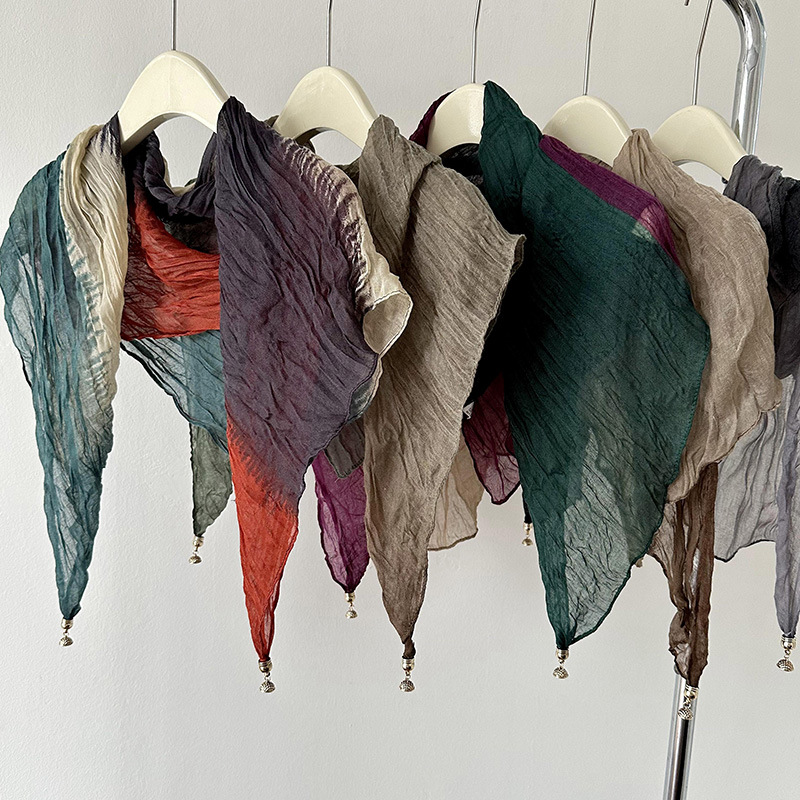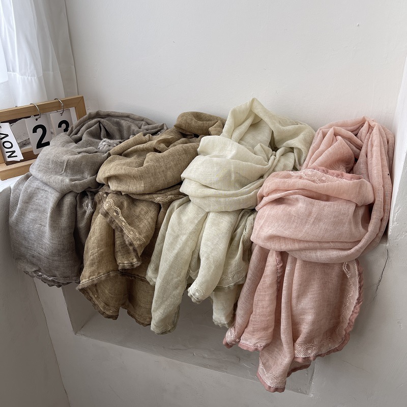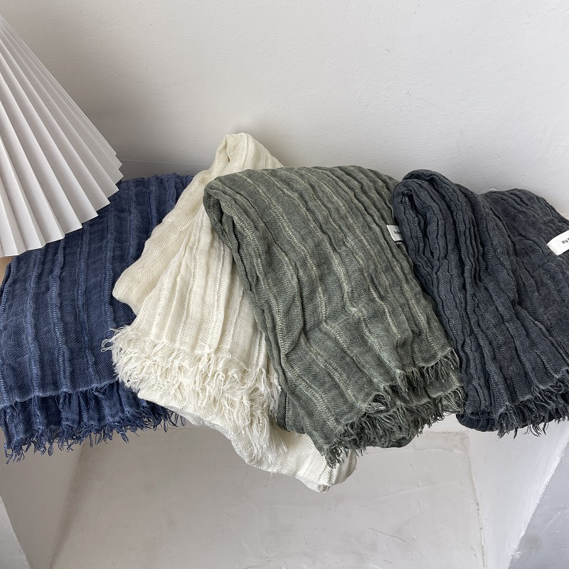 綿麻のような肌触りの無地プリーツソフトスカーフ、韓国風レトロエスニックスタイルのロングタイプ、春秋冬用暖かい単色ネックウォーマー
