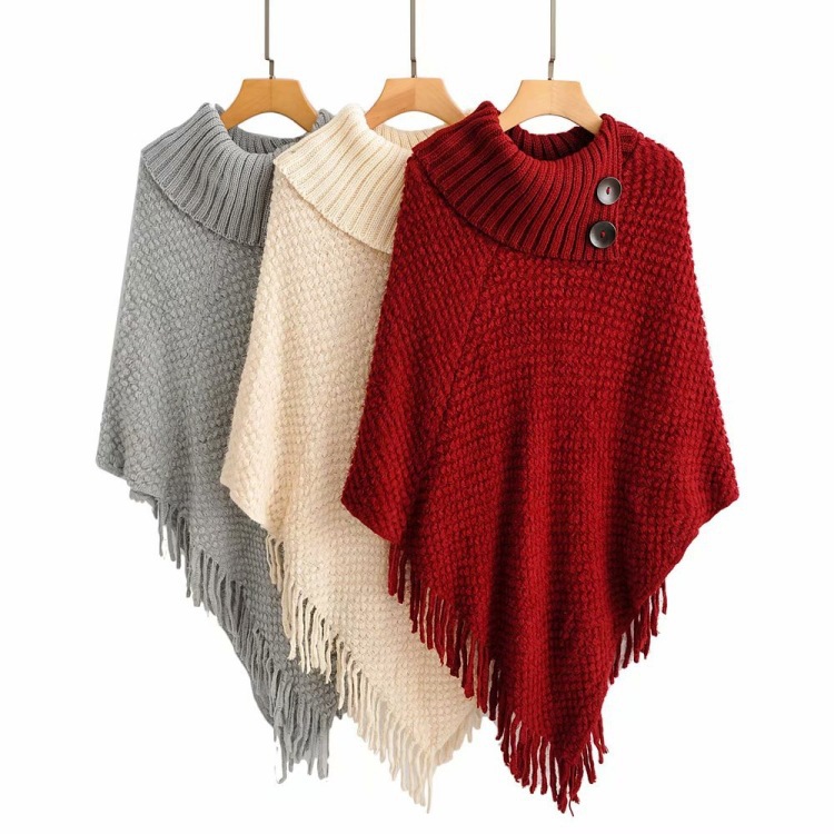 秋冬の新型欧米の外国貿易のフリンジのマントのマントのボタンの半開きの襟の純色のプルオーバーの女性のセーターのニットウェア