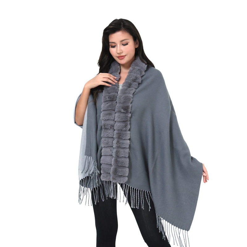 旗袍に合わせたニットのショール、短めのフリンジ付きファー襟付きの国風風暖かい春用ショール、着痩せ効果あり
