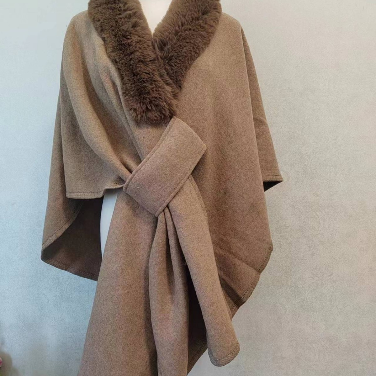 2025年秋冬新作 長袖 裏起毛 厚手 ファー襟 スパンコール付きショール おしゃれで万能な既製品ショート丈ケープ