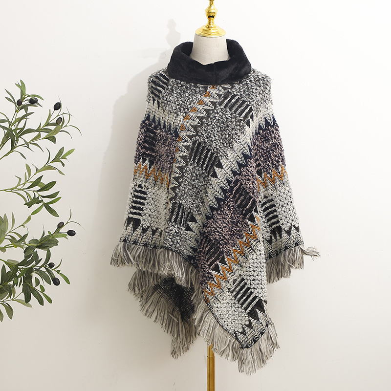 2024年の新型ニットフリンジの両面の格子の秋冬の外はマントの幾何学の新型の新型の保温を掛けます。