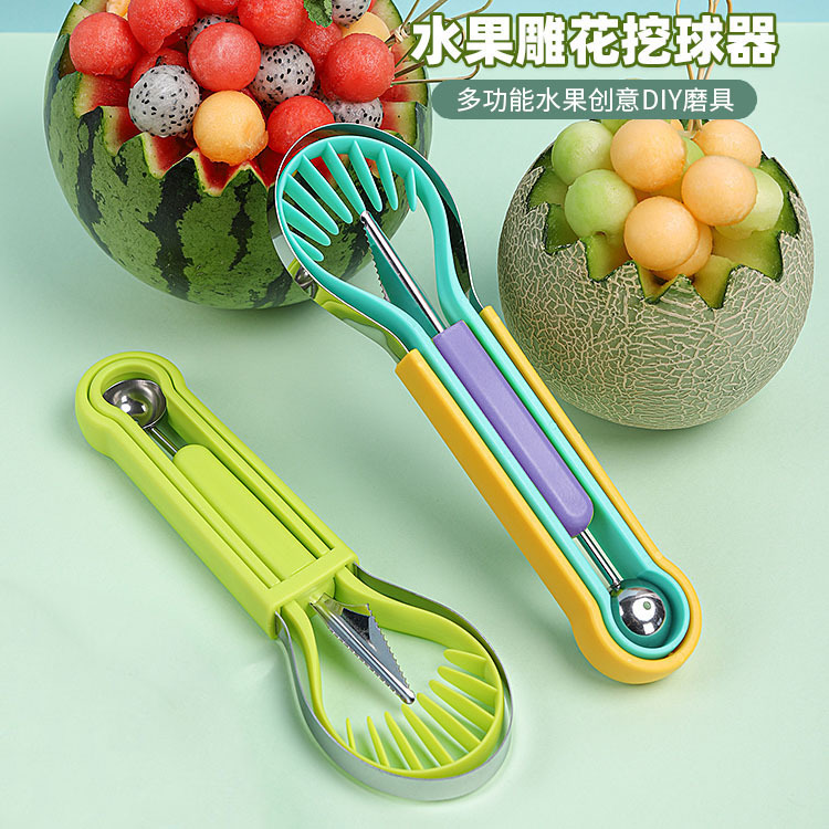 フルーツカットボール掘り器スイカボールスプーン果物掘り刃彫刻刀diy果物道具三合一セット卸売り
