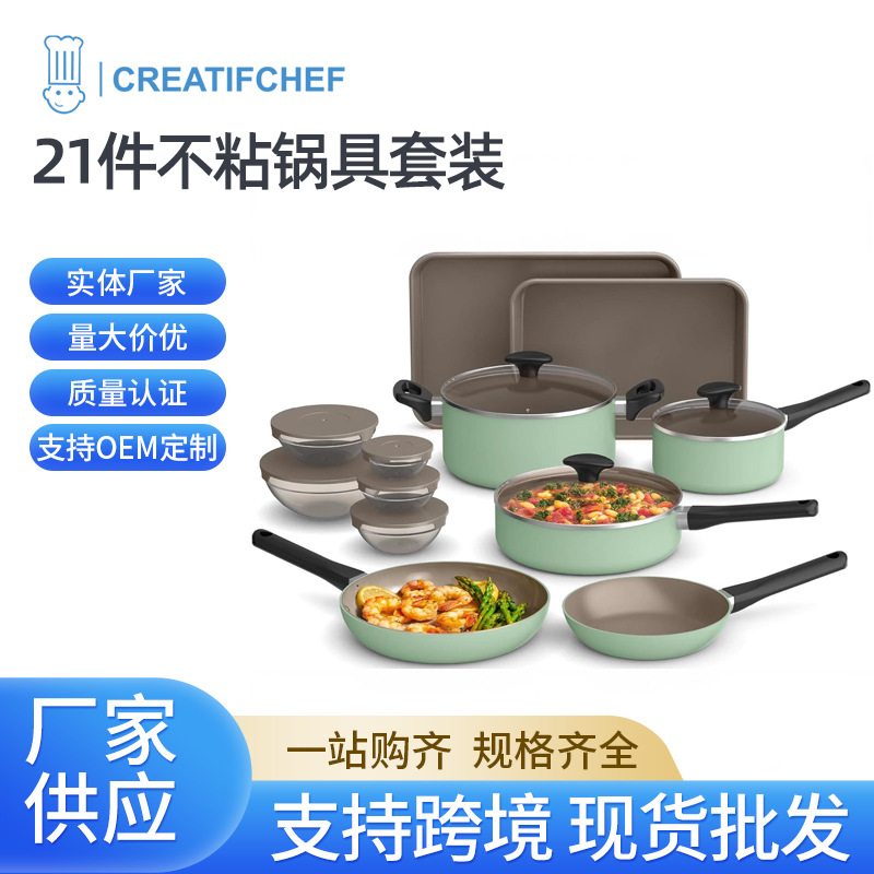 ガラス蓋付きグリーンカーボンスチールノンスティック調理器具セット21点、フライパン、フライパン、調理用ユニバーサルストーブ