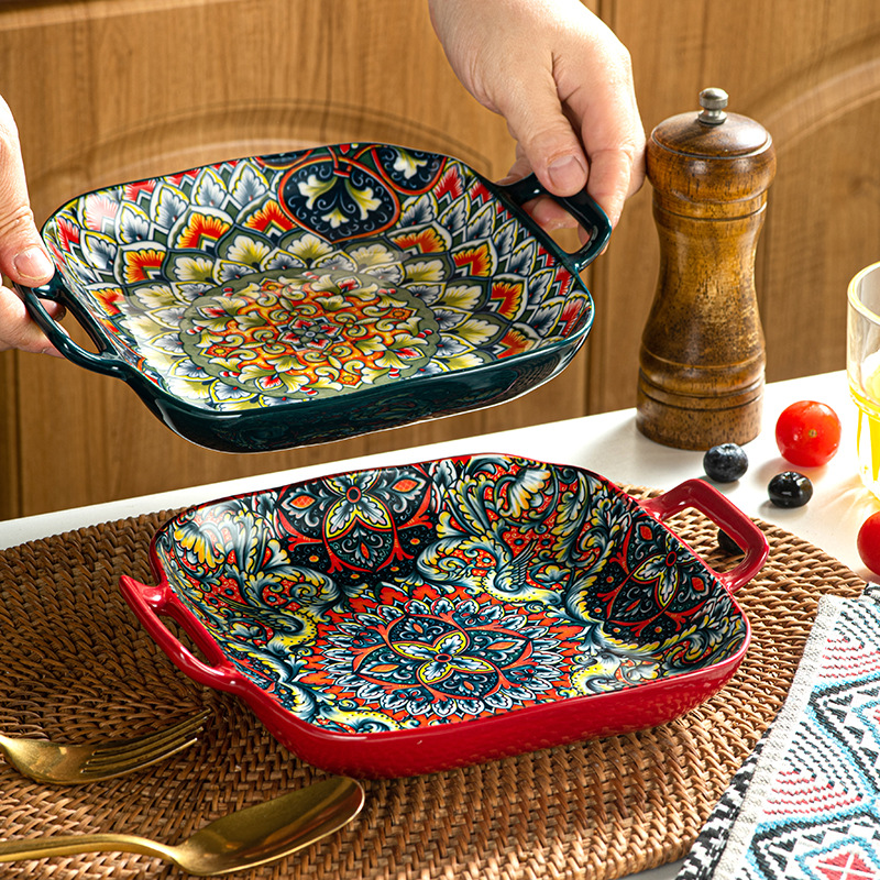 クロスボーダーボヘミアンバイノーラルプレート釉下色セラミック食器ベーキングパンクリエイティブ大型正方形ベーキングパン家庭用