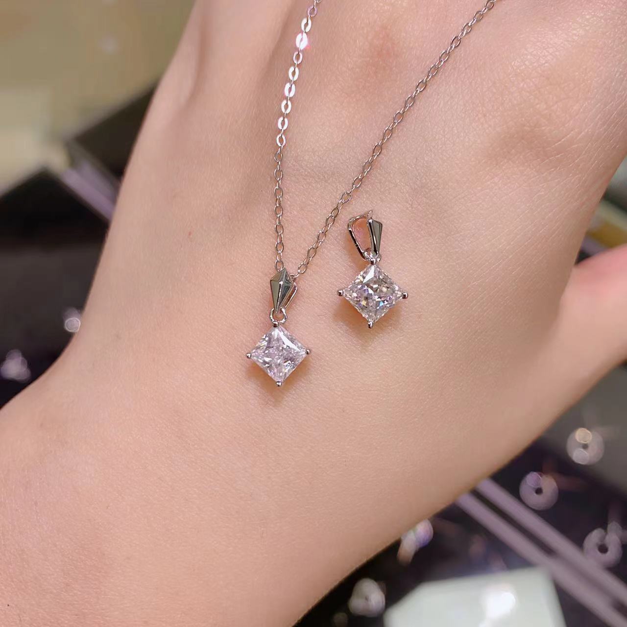 S925純銀満天星方包莫桑石ネックレス女性四爪シンプル方形ペンダント首鎖鎖鎖現物