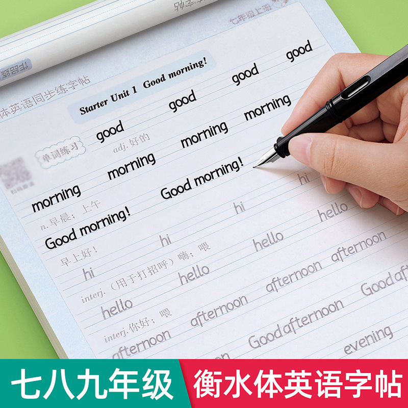 七八九年の学年の水の体の英語の字の帖の人は版を教えて同期して手本を模して英語の単語の練習をします。