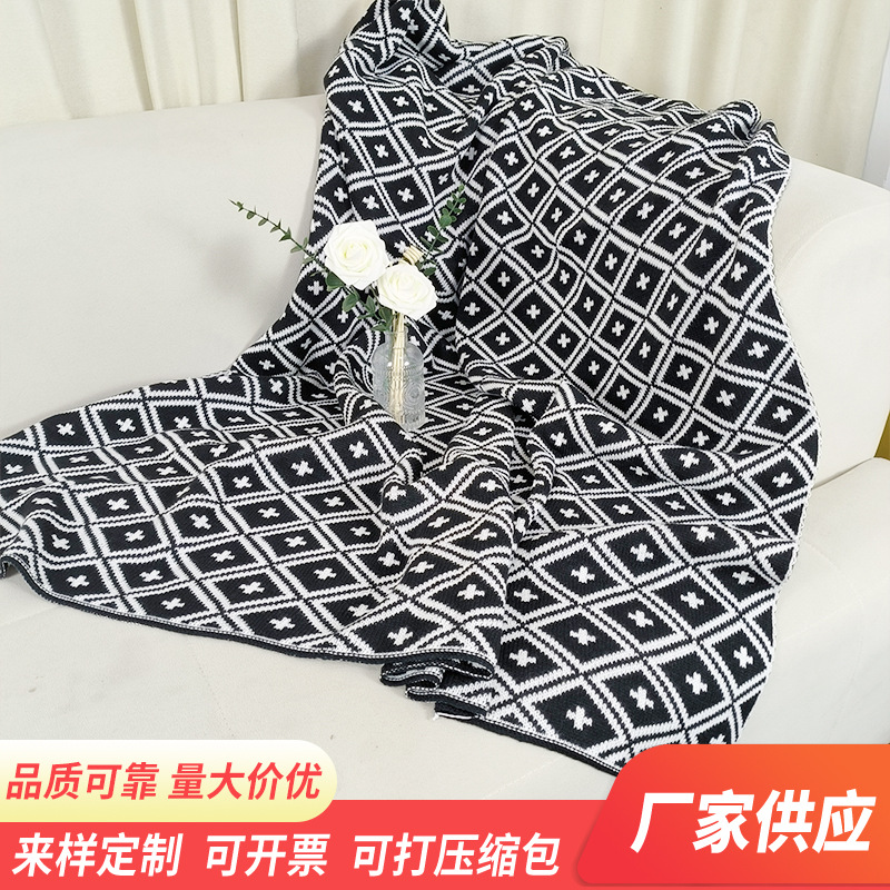 幾何学的なINSスタイルの黒と白の北欧ニット千鳥格子ハーフサイドフリースブランケットソファ装飾ブランケット昼寝ブランケット
