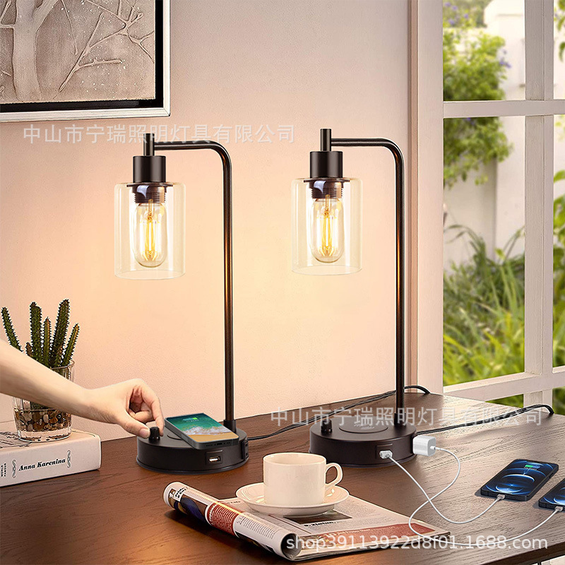 アメリカ式電気スタンド寝室多機能usbワイヤレス充電タッチ調光工業風ガラスled読書ベッドヘッドランプ