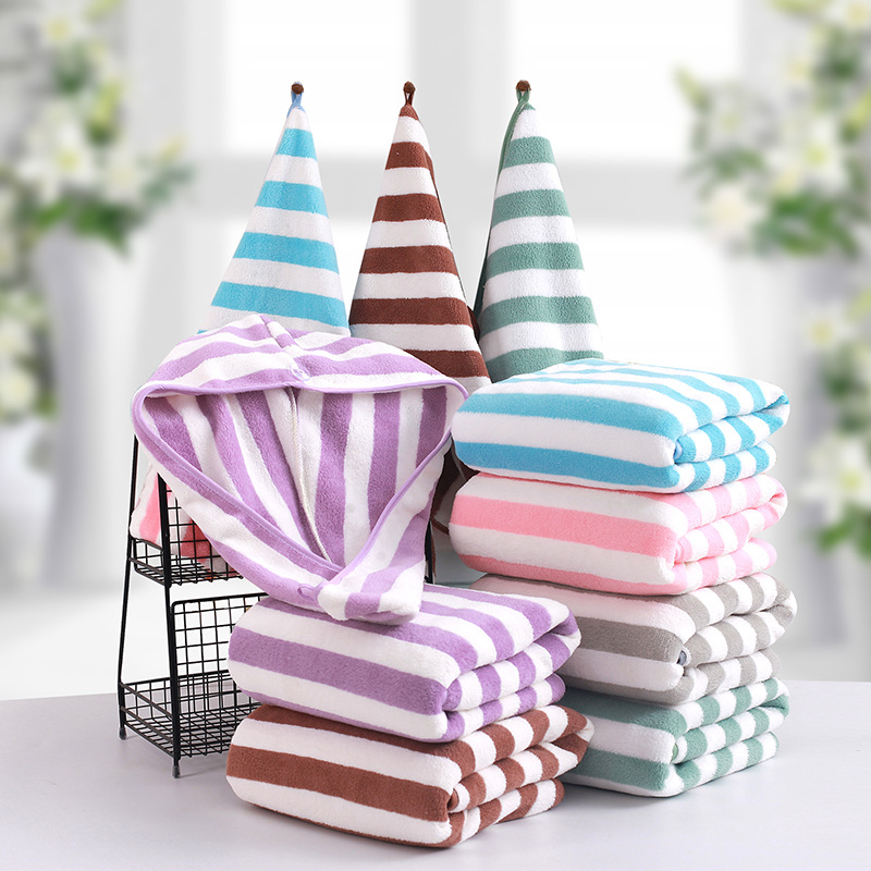 横断国境供給の経編ストライプコーラルベルベットバスタオル、厚手で吸水性があり、毛抜けしにくい、ギフトボックス入り、家庭用大型バスタオル