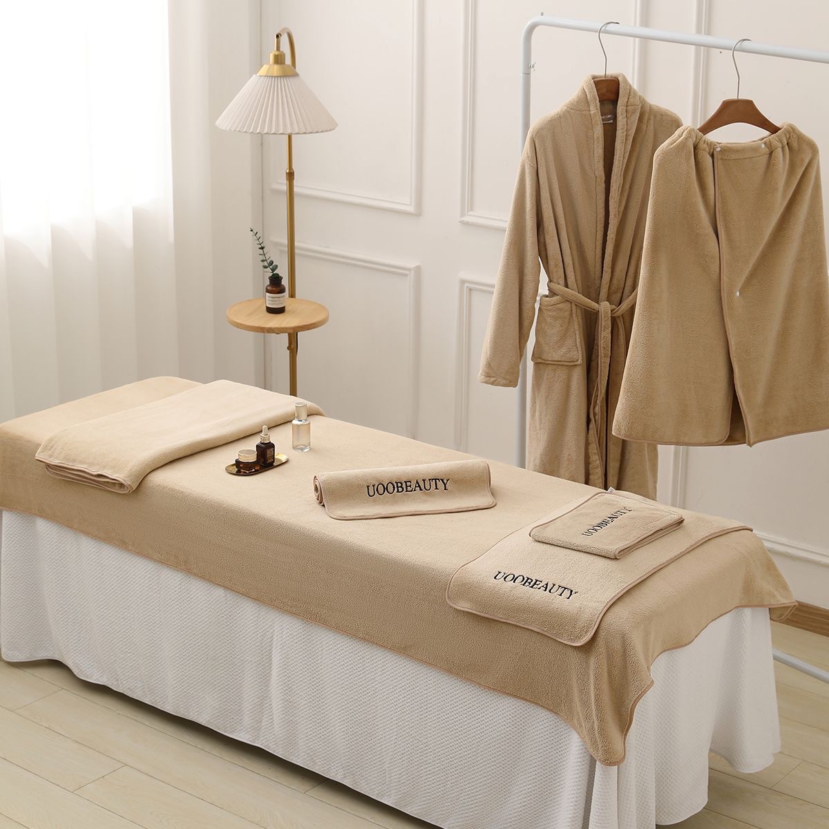 美容院用カスタム刺繍ロゴ入りヘッドスカーフ、毛抜けしないカバーリング、スキンケア5点セット、ヘッドホール付きベッドタオル