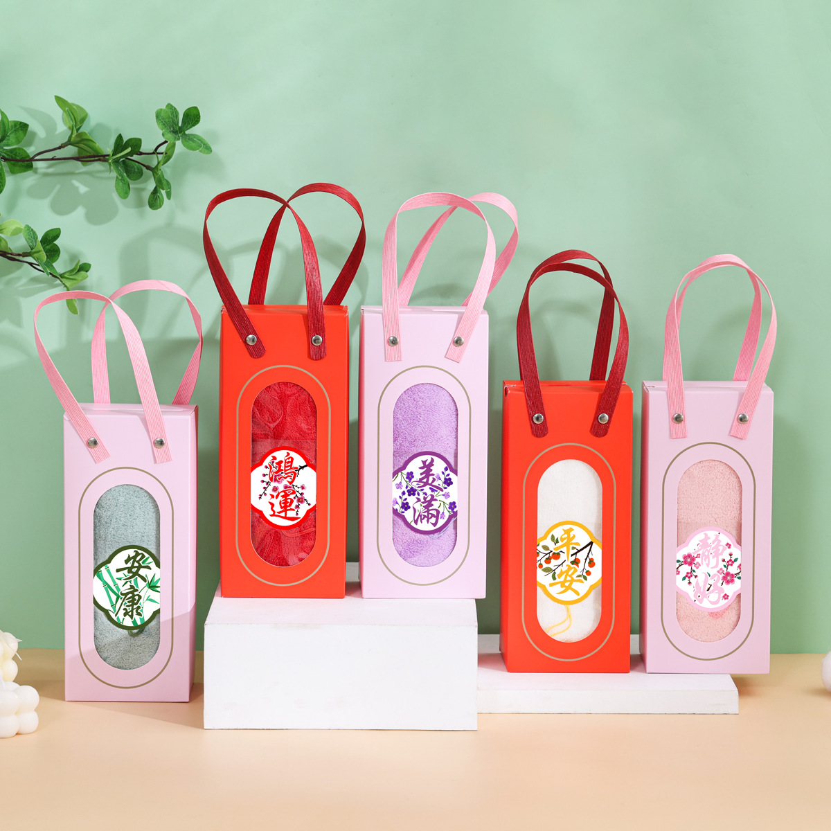 サンゴの毛のタオルのお土産の結婚のお返しの結婚式のタオルはカードの四角を縛ります。
