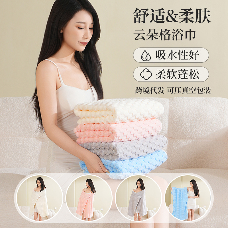 雲朵格珊瑚绒タオル・バスキャップ3点セット 工場卸売 肌に優しい 吸水性抜群 毛抜けなし バスタオル 吸水速乾