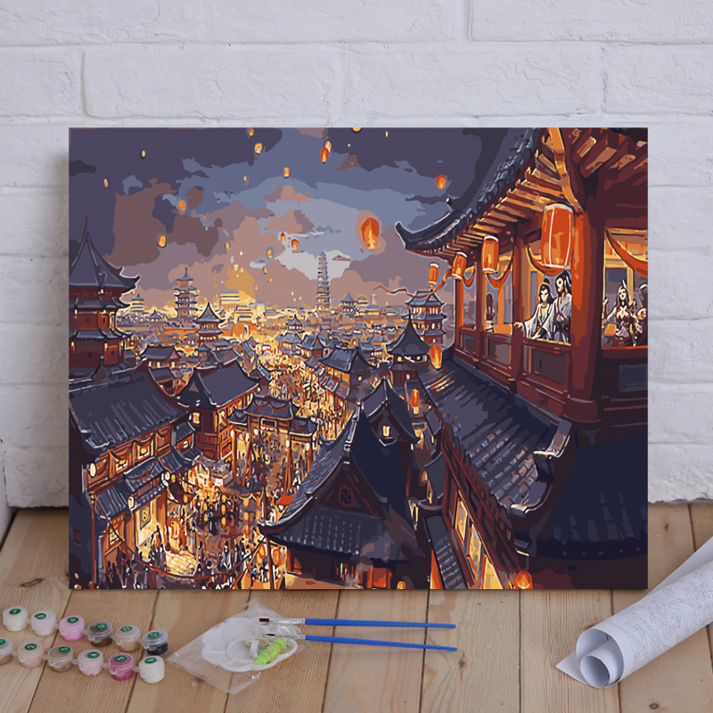 22N華灯初上デジタル油絵diy復古風夜景孔明灯手描き中国風充填塗装泉融