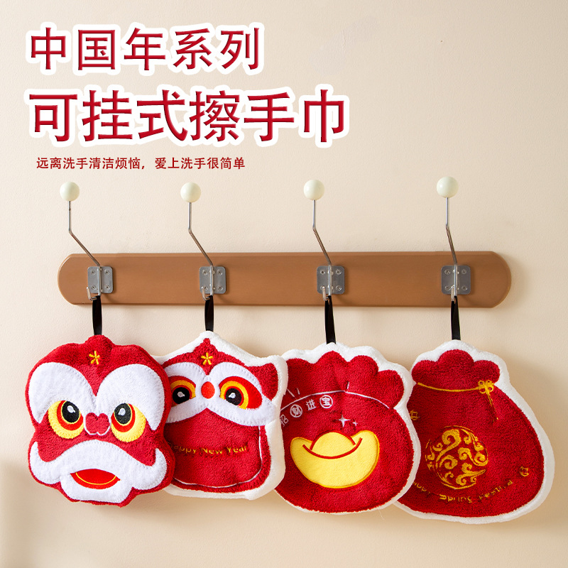 春節用赤い手拭きタオル、吊り下げ式吸水布、三層厚手コーラルベルベットキッチンタオル、ハンカチ、手拭き、新年