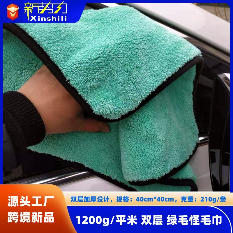 1200gの緑の毛の怪は水のタオルを収めて厚い二重のサンゴの毛の洗車のタオルの細い繊維の吸水は車の布を拭いて卸売りします。