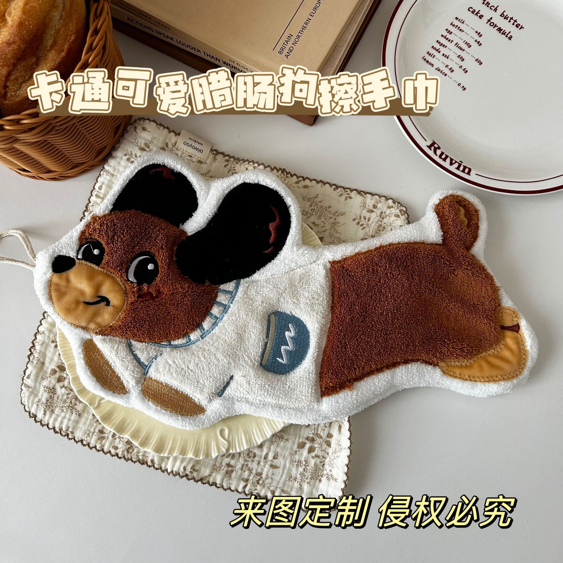 著作権刺繍アニメかわいいソーセージ犬子犬が手ぬぐいを拭くことができます。
