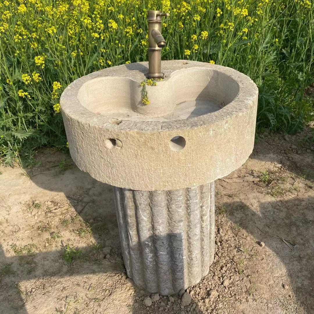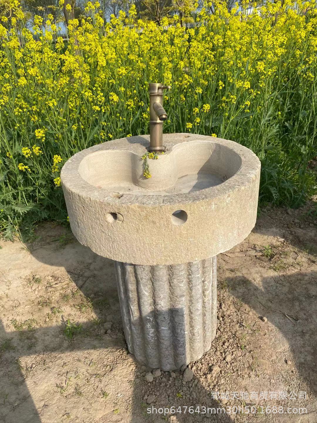 古い石臼水盤、景勝地の臼水盤、洗面台、田舎の古い石臼水盤、茶台