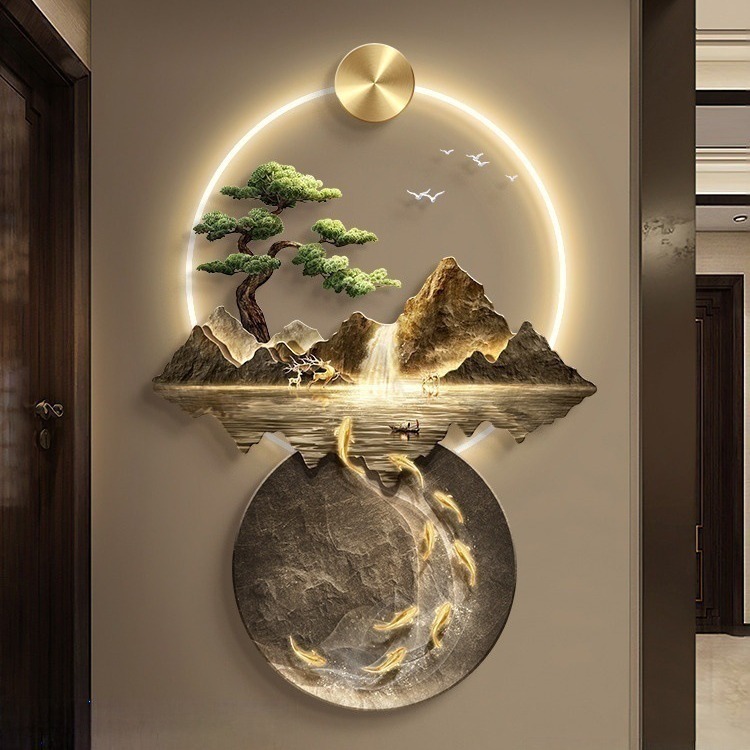 新中国式入戸玄関装飾画流水生財山水画灯付き廊下通路掛け絵迎客松壁画