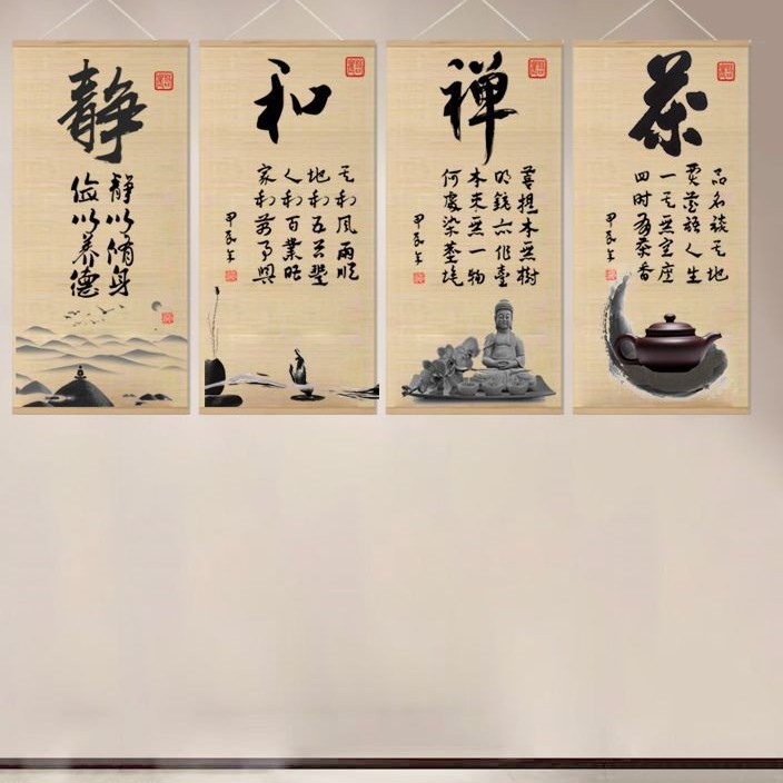 禅意書画玄関寝室廊下四連画竹編み装飾画竹シルク画客間背景壁竹カーテン掛け画