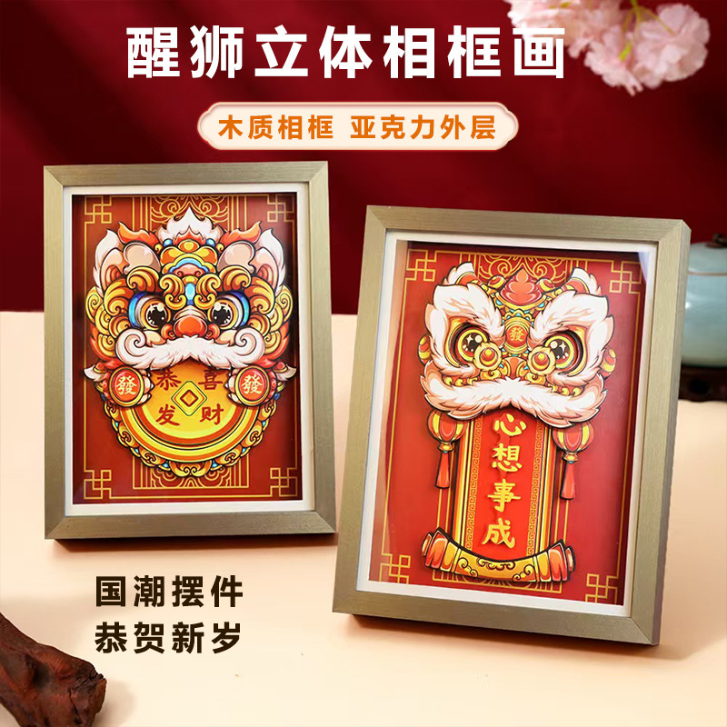 招財進宝新年フォトフレーム置物国潮非遺産カット紙客間覚醒ライオン立体装飾品工芸品プレゼント