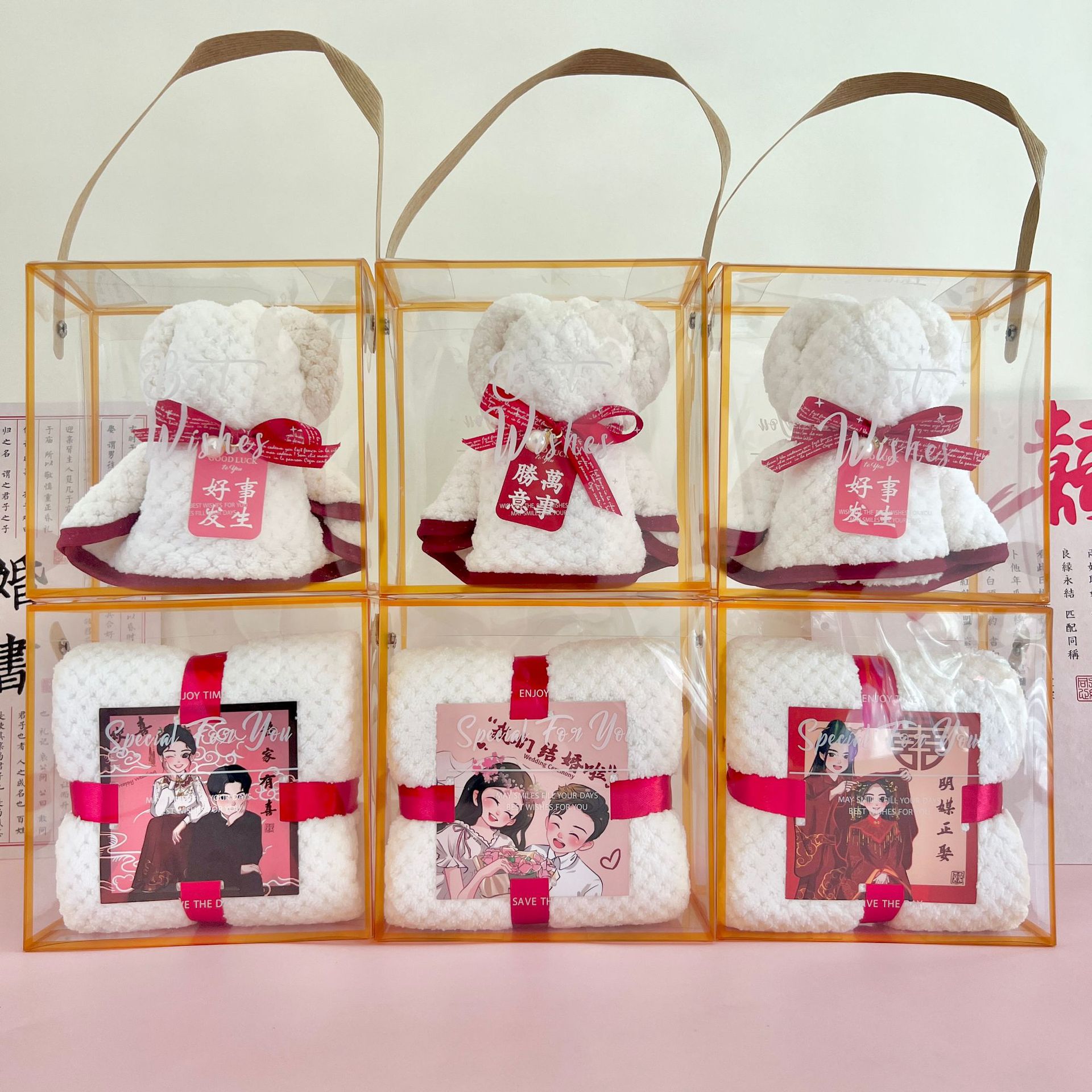 結婚タオルのお土産ベアータオルの結婚式のギフトボックスは、喜パの赤い花嫁のブロックタオルと結婚してお返しします
