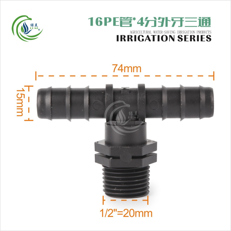 17mm園芸用点滴灌漑パイプ、直接外ネジ式三方接続継手、農業用点滴灌漑テープPEパイプ、倒刺付き接続部品の卸売