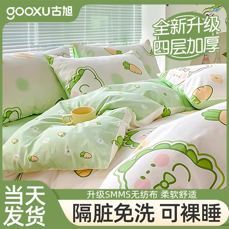 使い捨て四点セット旅行出張ホテル寝具緑黄色ピンクプリント布団カバー寝台枕カバーシーツ