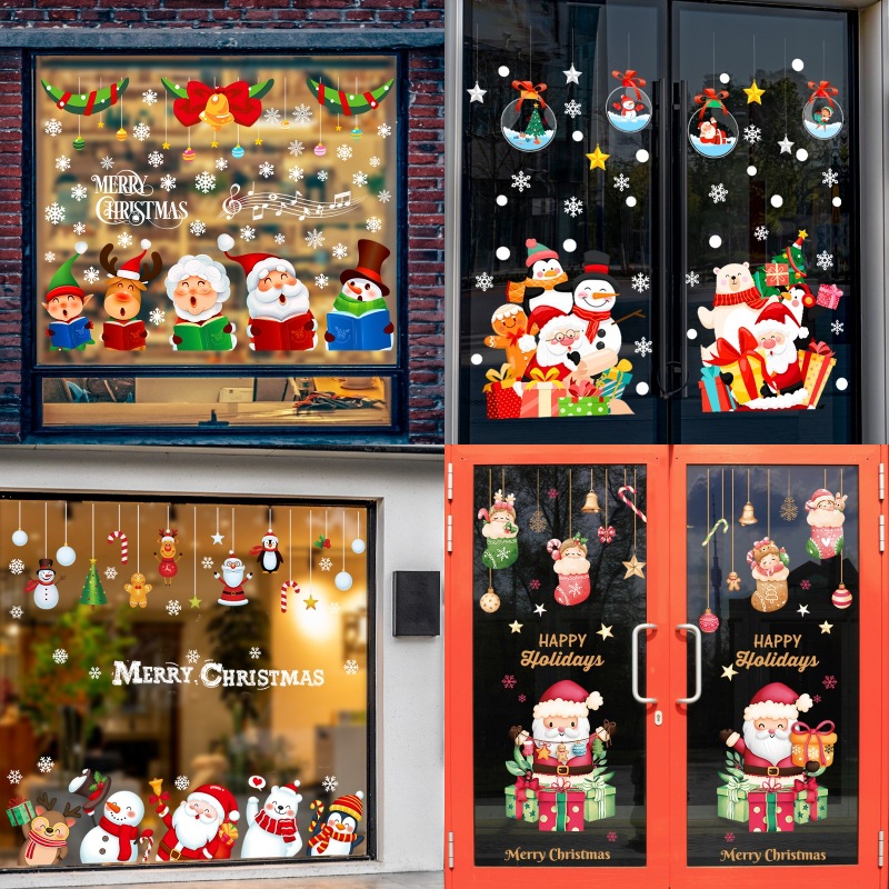 クリスマスの装飾のステッカーのガラスはショーウインドーの新年のドアを貼ってシーンを配置します。