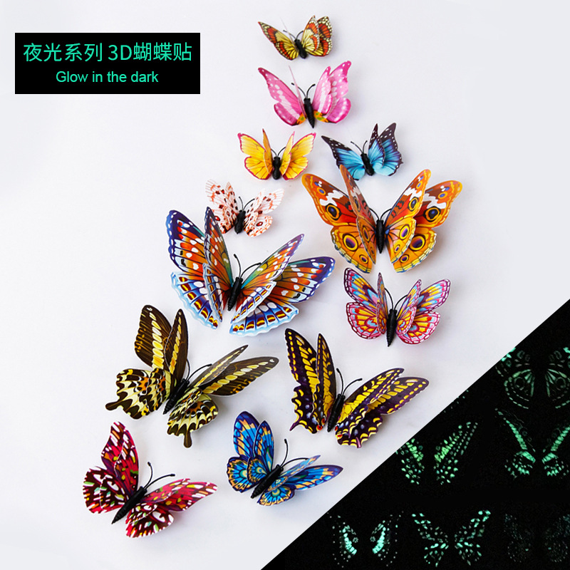 夜光二重pvcシミュレーション蝶3d立体蝶壁貼り寝室背景壁装飾夜光蝶壁貼り
