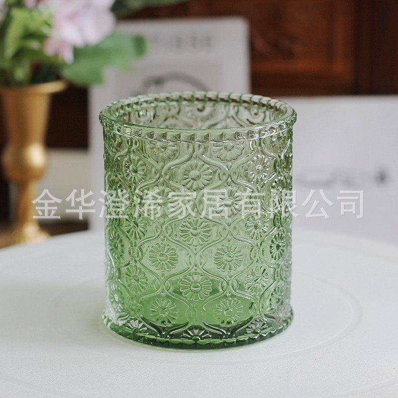 軽くて豪華な復古風の浮き彫りの彫刻ガラスの化粧ブラシは缶の小さい花瓶の筆立ての燭台のアイデアのデスクトップの置物を収納します。
