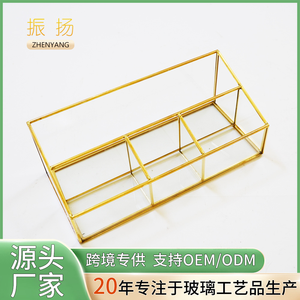 ガラス化粧ブラシ収納バレルデスクトップ横式三格ペンホルダー収納ガラス銅バーマスク収納ボックス