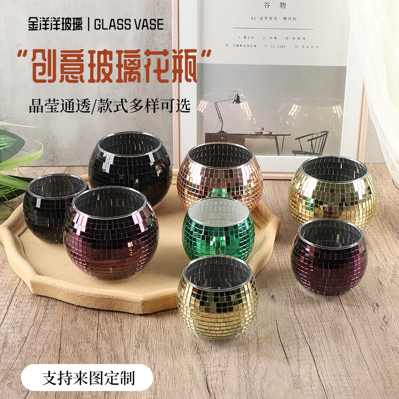 ガラスモザイク燭台レトロフラットディスコレンズ植木鉢香りキャンドルカップ多肉植木鉢筆立て