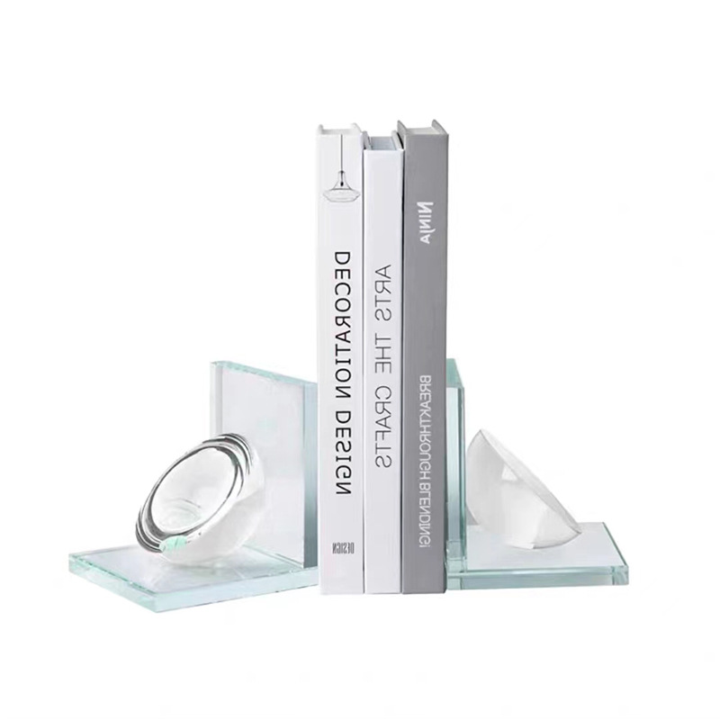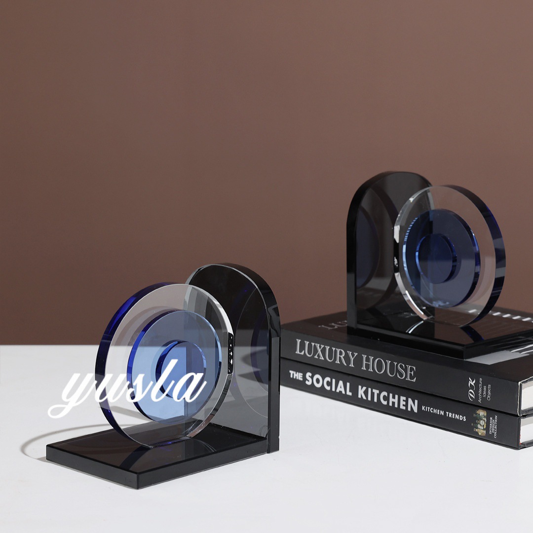 シンプルで現代的な創意的な目の本は水晶のガラスの本の枠によって書斎の机の本の立の見本の間の装飾品を並べます。