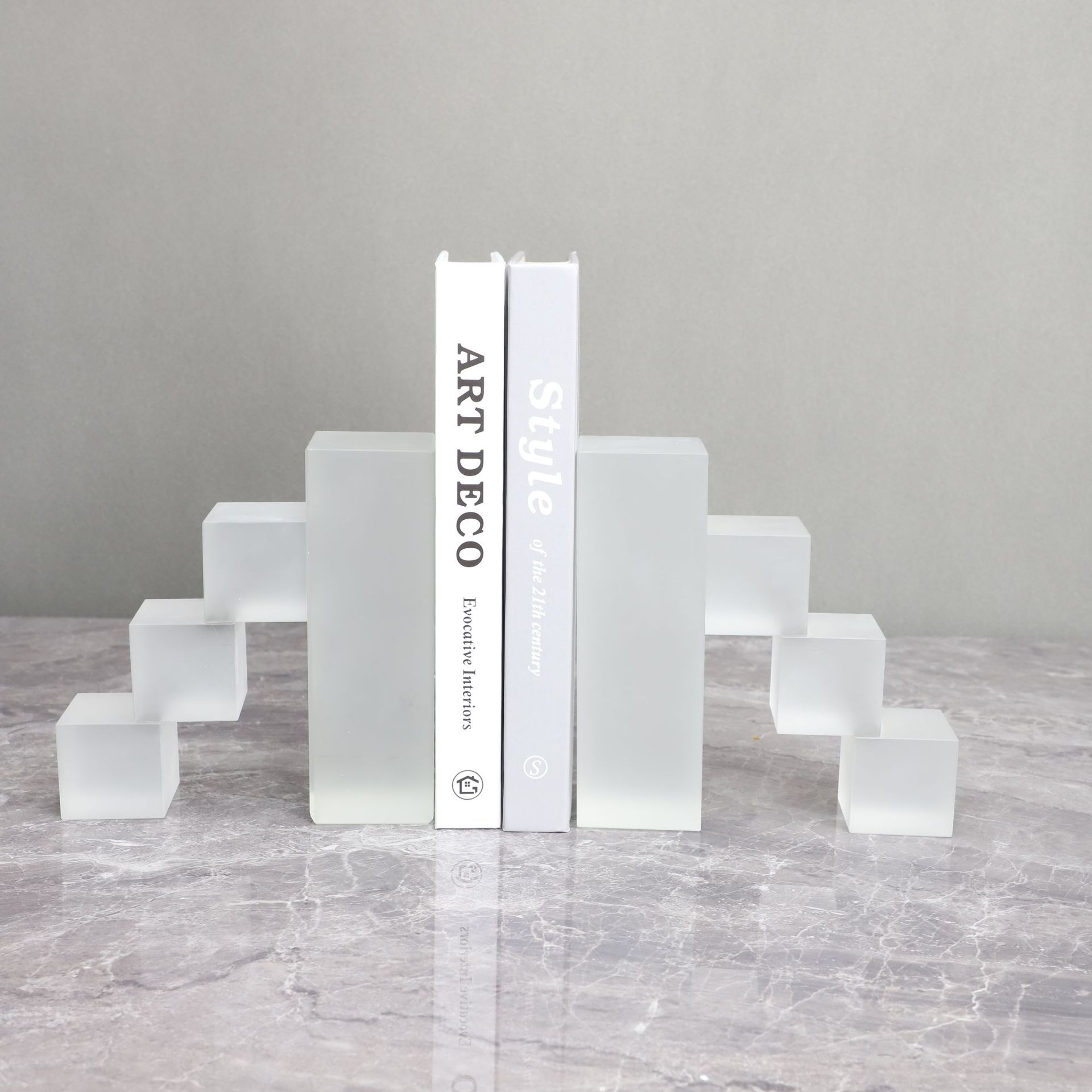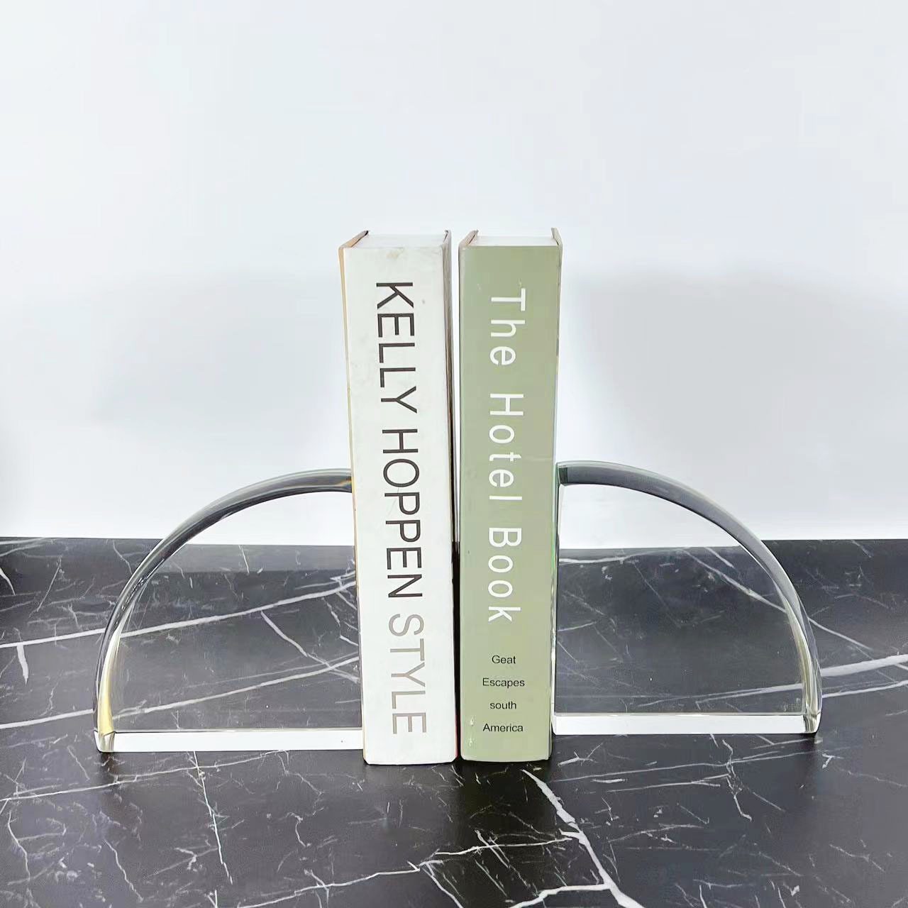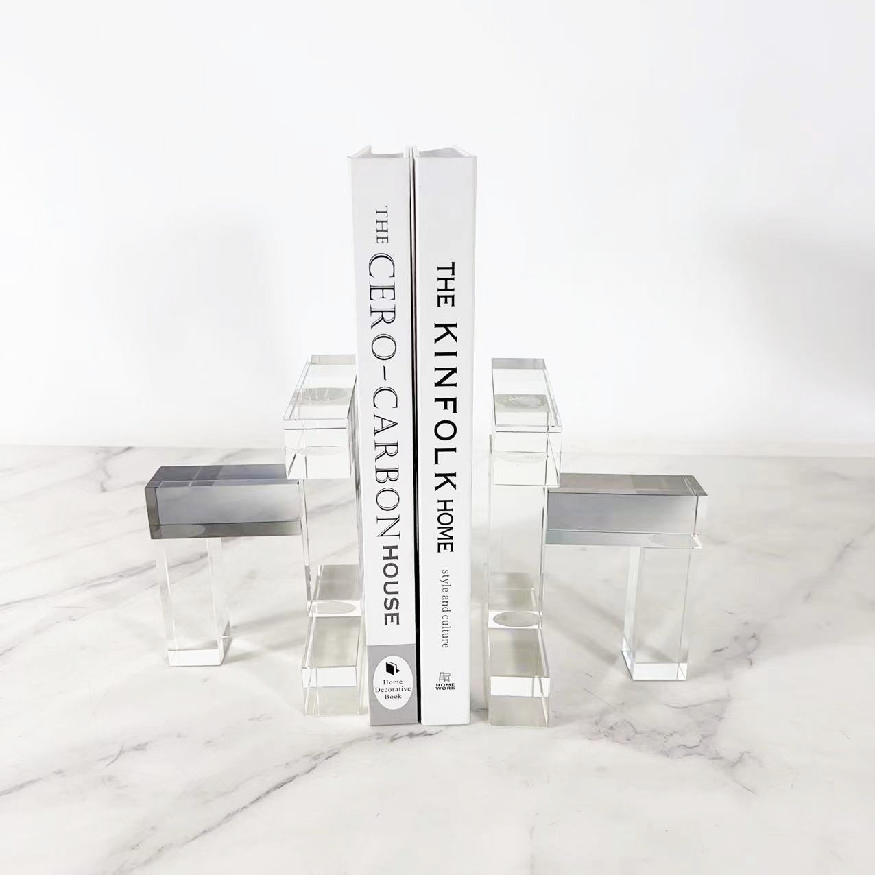 シンプルで現代的な透明な幾何学水晶の本の枠は家庭の柔らかい装飾品のサンプルの部屋の書斎のアイデアの本を並べます。