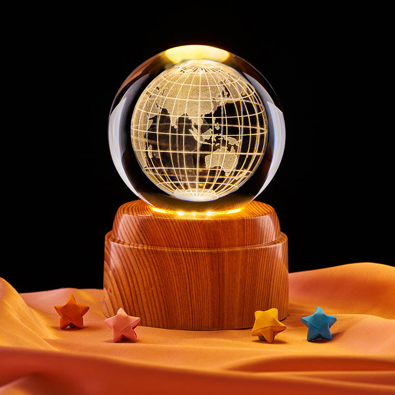 クロスボーダー暖光回転木目木ベース発光水晶球小夜灯水晶球3d立体レーザー内彫刻
