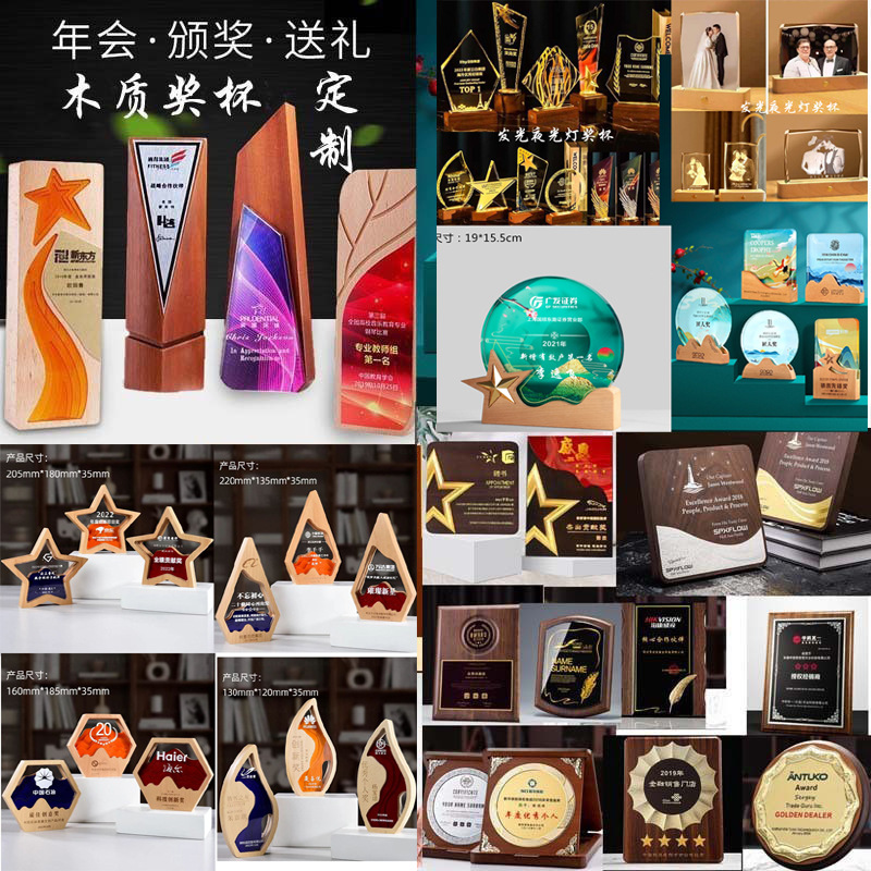 高級木造水晶トロフィー卸売り創意実木メダル授権牌置物年会企業従業員記念品