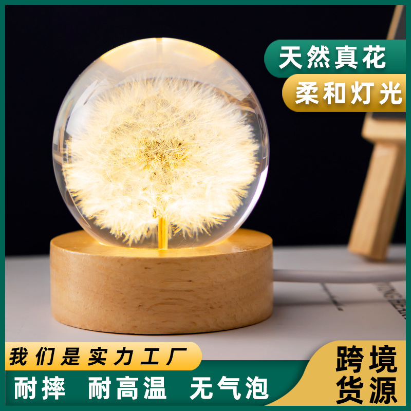 国境を越えたタンポポ水晶球小夜灯永生花3d内彫刻発光実木ベース水晶プレゼントm 2