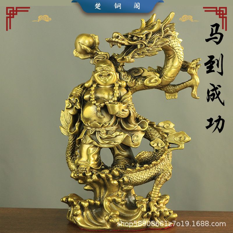 純銅の弥勒仏の置物は龍に乗って笑います。