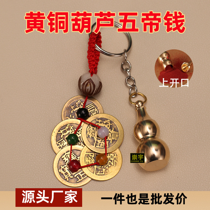 メーカー卸売り黄銅五帝銭ひょうたん財福袋に5色のビーズのキーホルダー車の鍵ストラップのアクセサリー