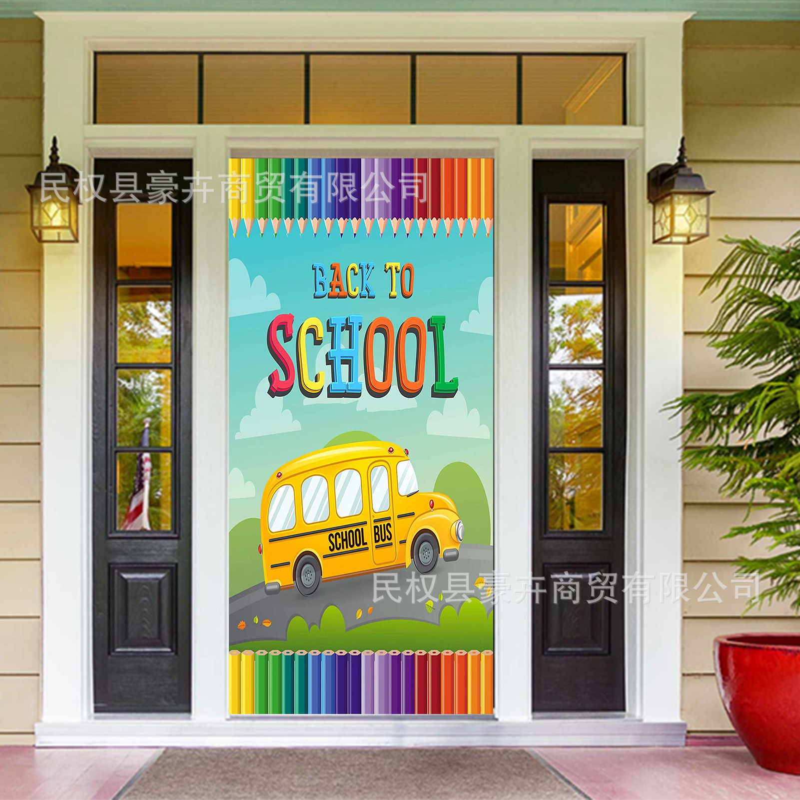 アマゾンの新型開校シーズンのドアのカーテンは旗のカラーのクレヨンのバスを掛けます。