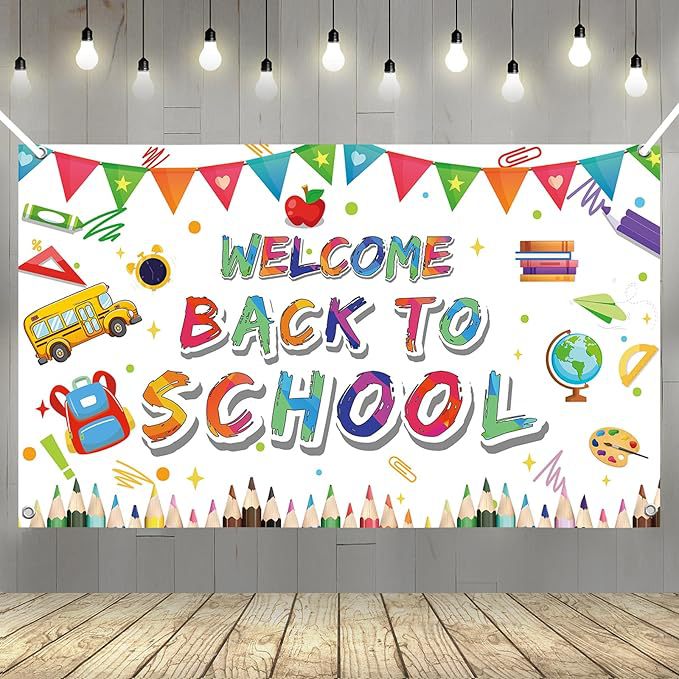 国境を越えたアマゾンの新しい入学シーズンの背景布黒板カラーペン児童が学校シーズンのパーティーに戻って横断幕を飾って旗を掲げた