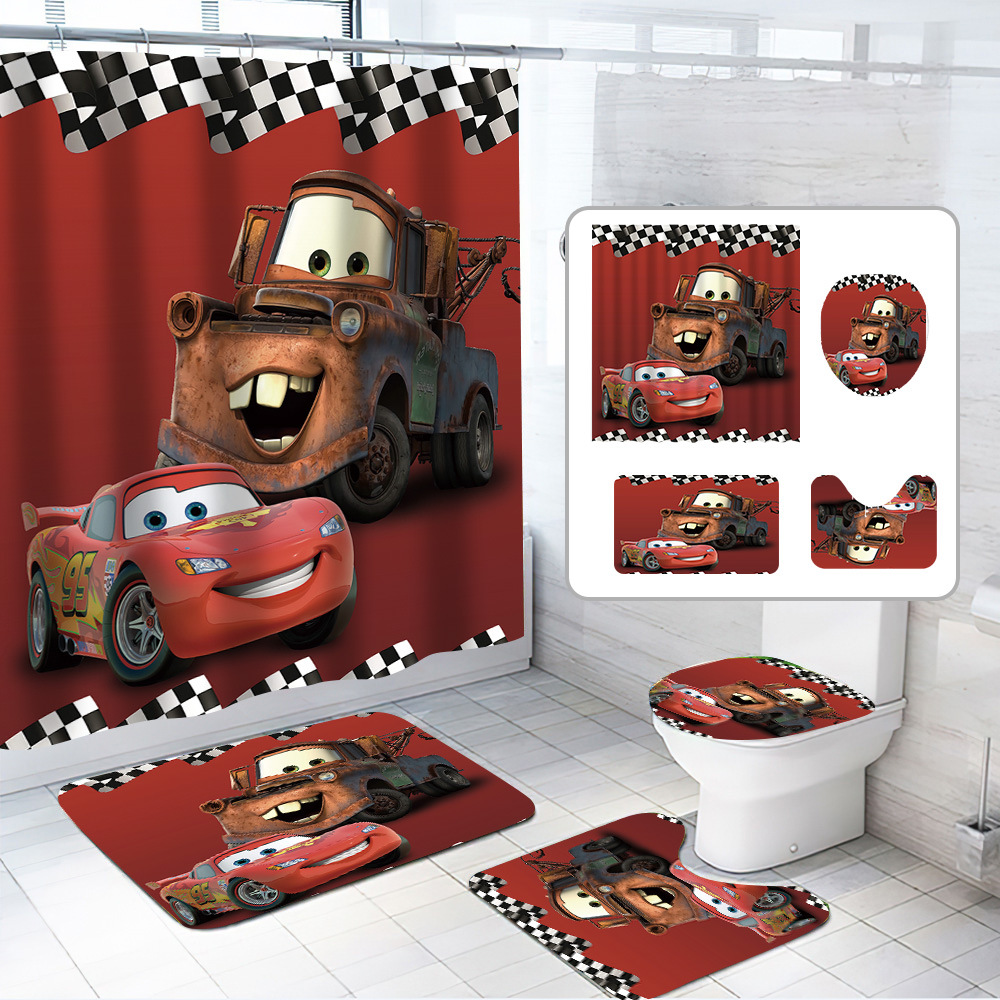 外国貿易の漫画の紫色の小さい自動車はかびを防いで厚いポリエステルの浴室のシャワーカーテンの4つのセットの地面の便器のマットの足のマットを厚くします。