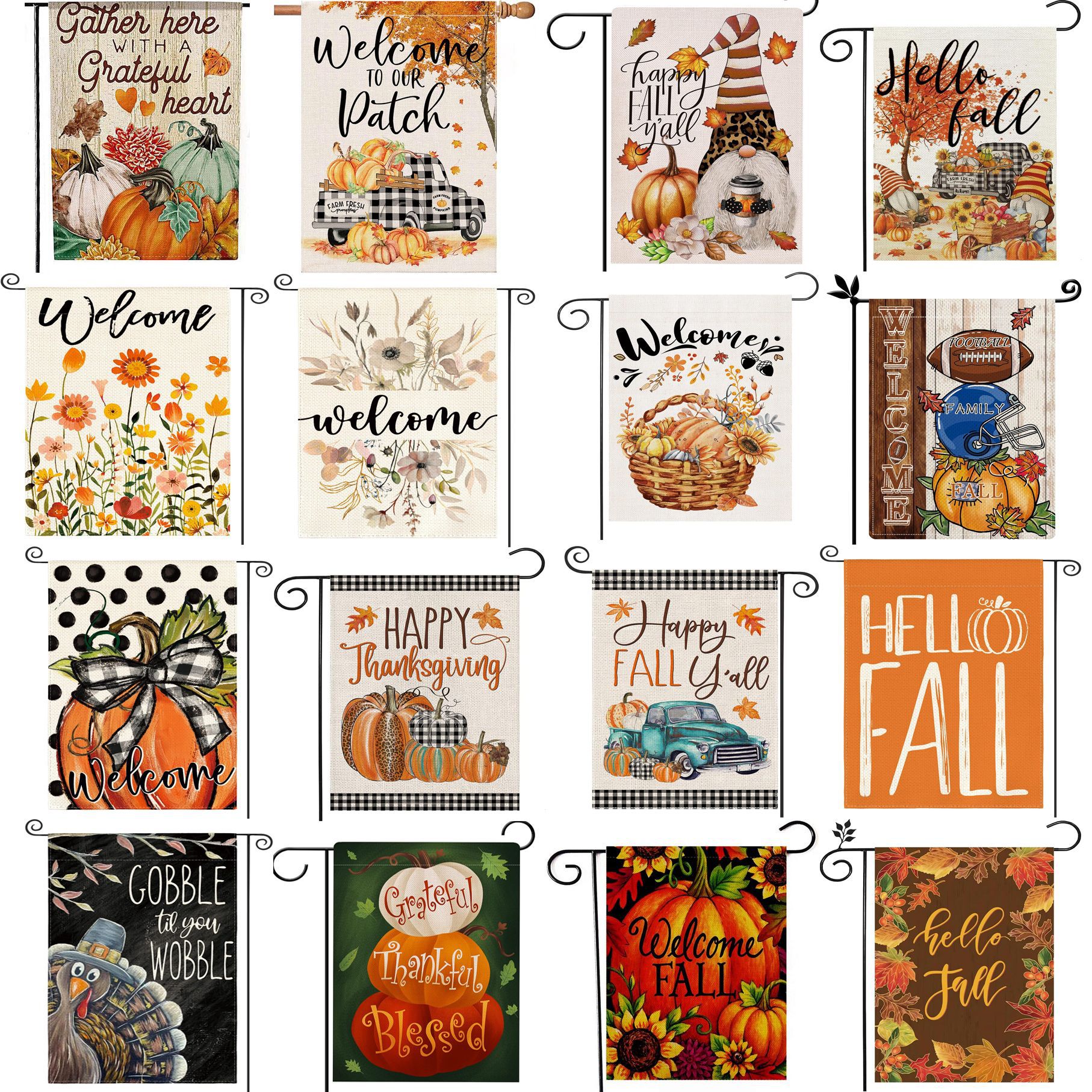 秋カボチャカエデの葉両面プリントリネンガーデンフラッグ感謝祭装飾中庭フラグホームウェルカムフラッグ