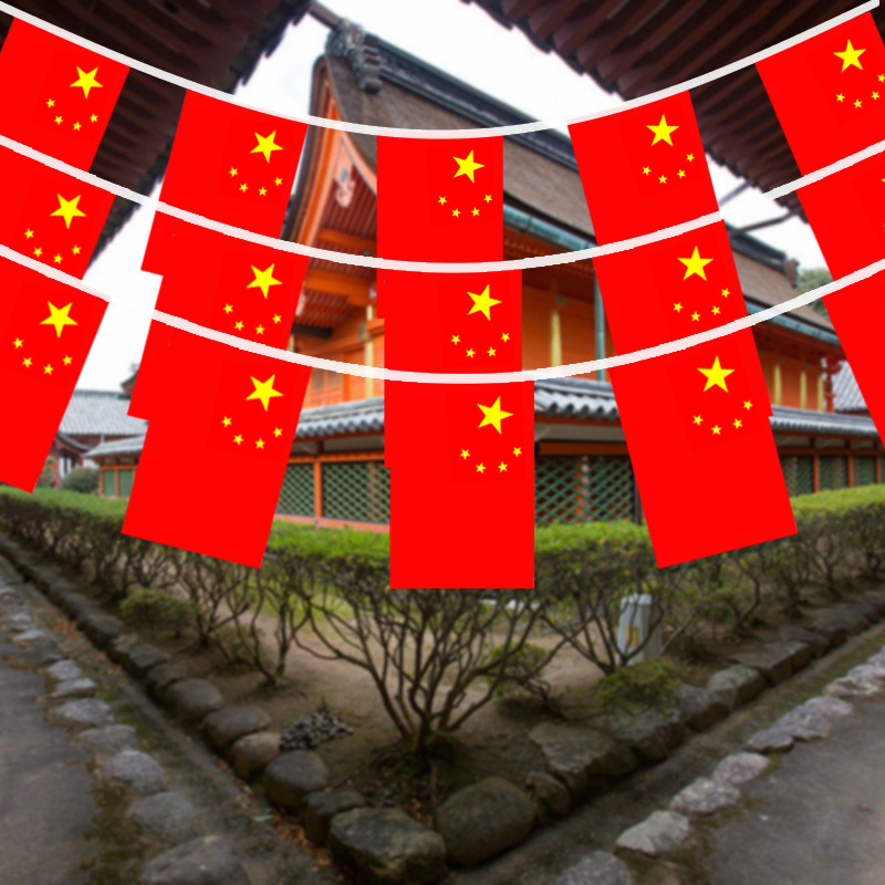 卸売りの小国旗は旗をちりばめて太いナイロンの縄の五星紅旗の国慶節の装飾の小紅旗の雰囲気をプラスして小旗を配置します。