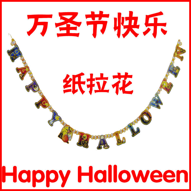 ハロウィーンの場所に幽霊の日の道具を配置するカボチャの花の頭蓋の紙の花のハロウィーンの横断幕のカラーバー
