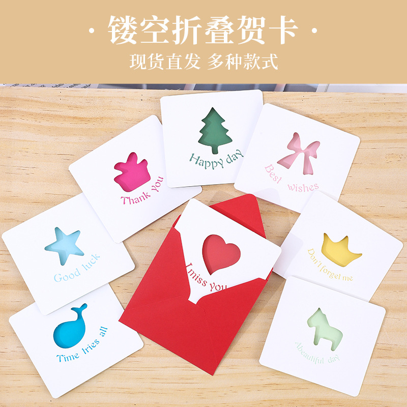 クリエイティブなカラフルな中空グリーティングカード、折りたたみ式の小さなカード、クリスマス感謝祭のグリーティングカード、バレンタインデーのグリーティングカード、愛のマッチング封筒