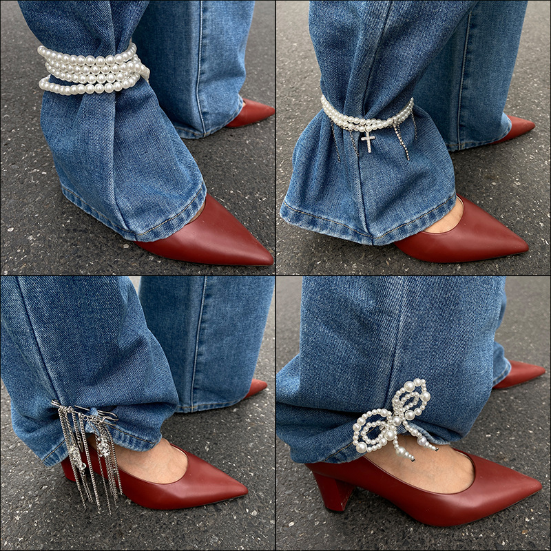 欧米国境を越えたアクセサリーins三層ハイライト真珠手作り魚糸編み靴チェーン幾何学高級感足飾り