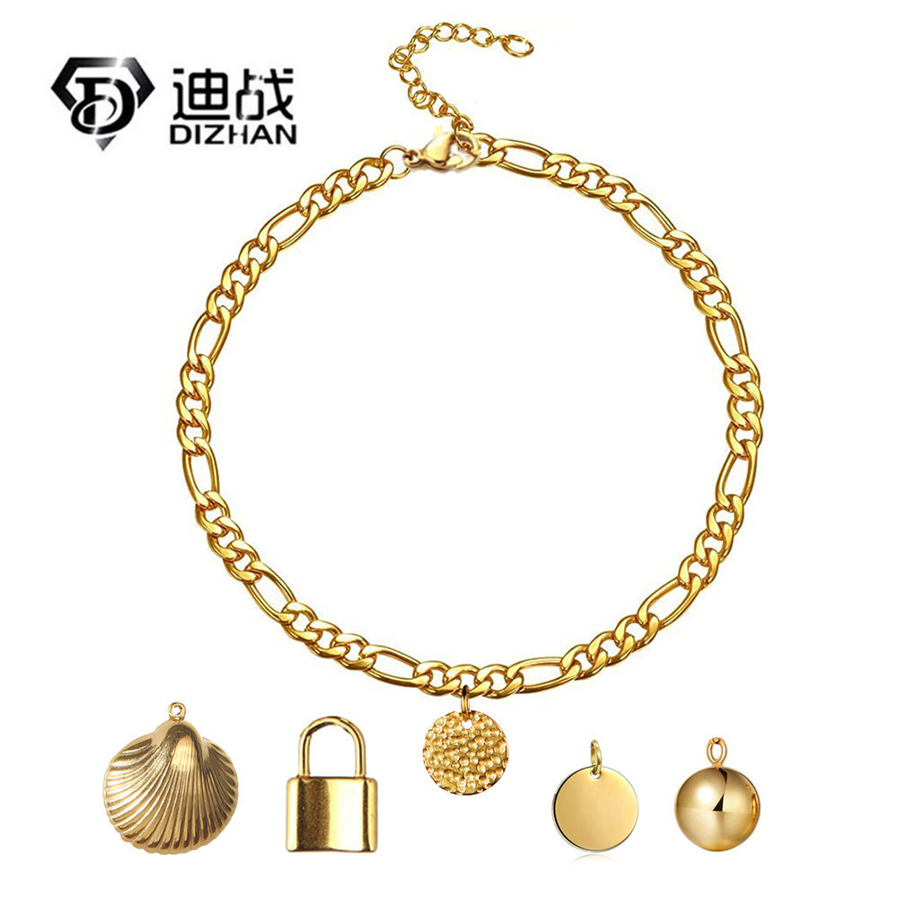 新型流行パンク風ステンレス貝殻ロック凹凸貨幣円玉ペンダントフィガロ足鎖