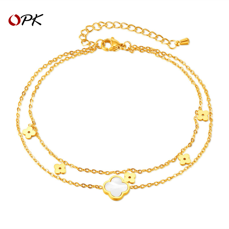 OPKアクセサリー工場フランス式ファッション大衆透かし彫り白母貝花二重チェーンステンレス女性足チェーン