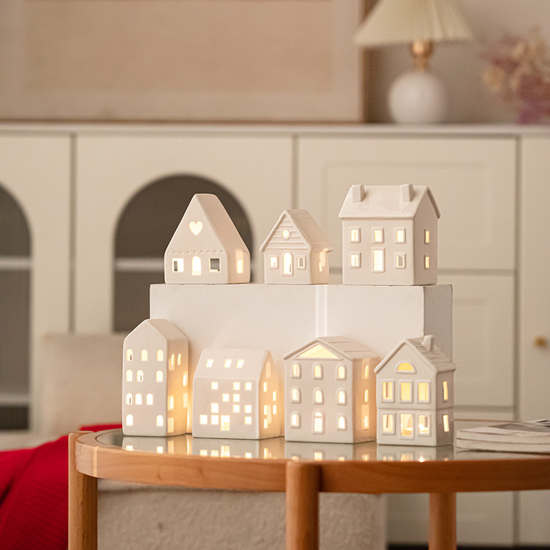 クロスボーダーのクリスマスの透かし彫りの陶磁器の家の燭台の置物のデスクトップの白い磁器の小夜の明かりのヨーロッパ式の雰囲気は風灯を飾ります。